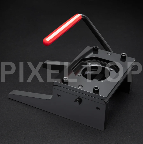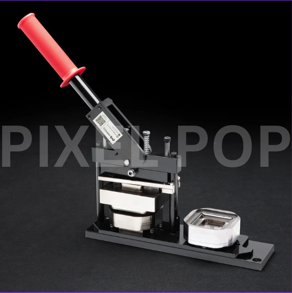 Professional-grade button maker for creating custom square buttons and magnets. All-metal construction with cam-on-roller design requires minimal force to operate.